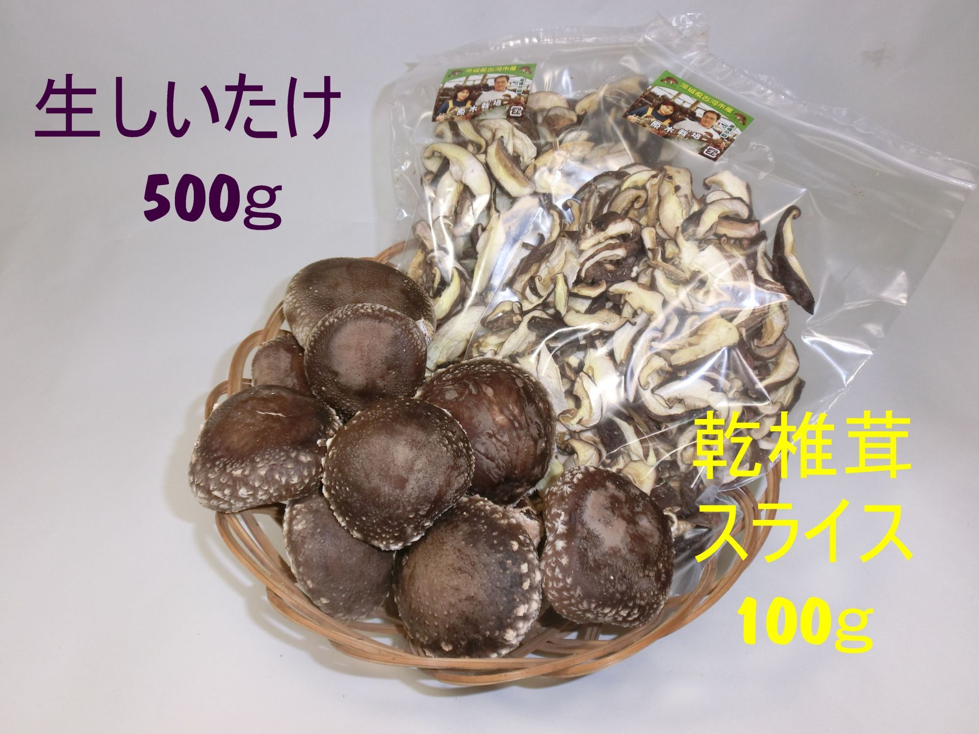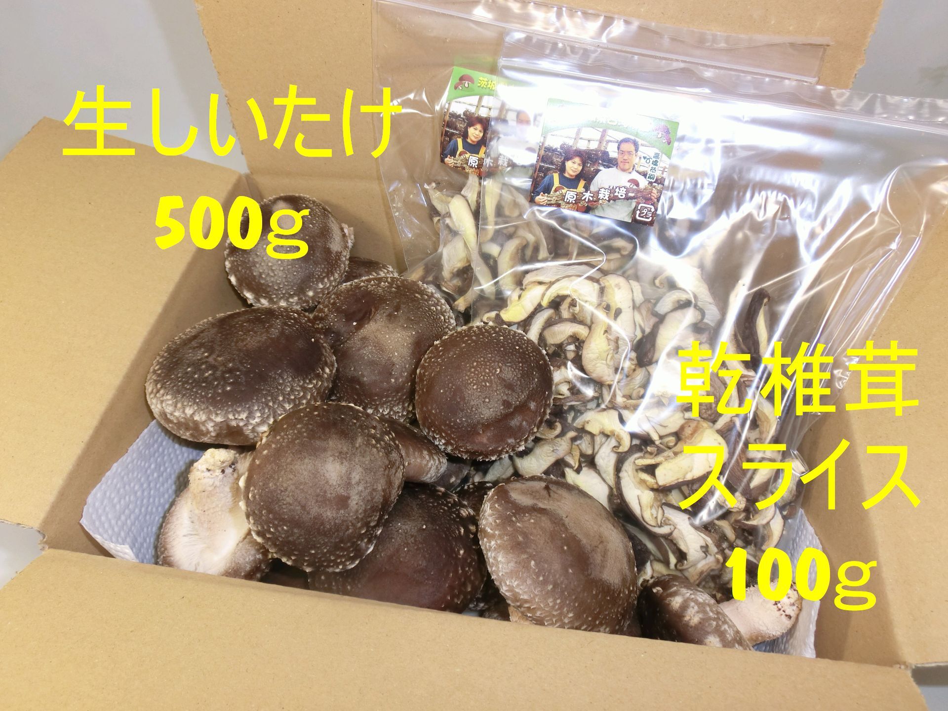 原木栽培の生しいたけを500g、乾椎茸スライスを100gのセット商品です。